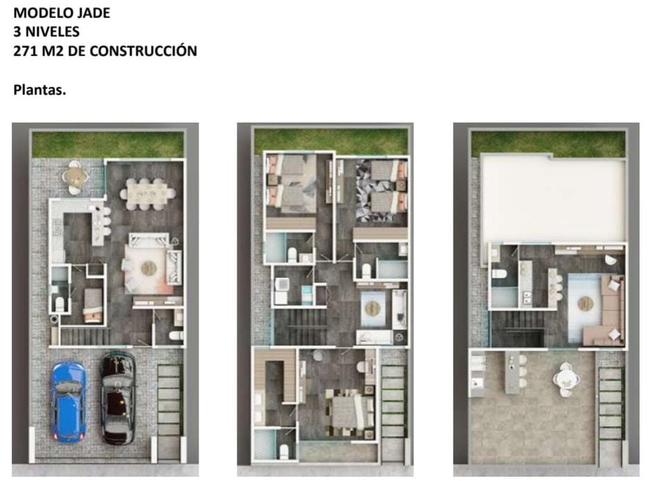 Cada una cuenta con 3 recámaras, cuarto de servicio con baño, sala de juegos o TV en tercera planta con baño completo y terraza. Cochera para 2 autos.